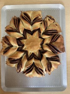 ETAPE 9 : Prendre les bouts de pâtes découpés 2 par 2, et torsadez-les vers l’extérieur 2 fois. Vous formez ainsi un joli flocons de neige 🙂